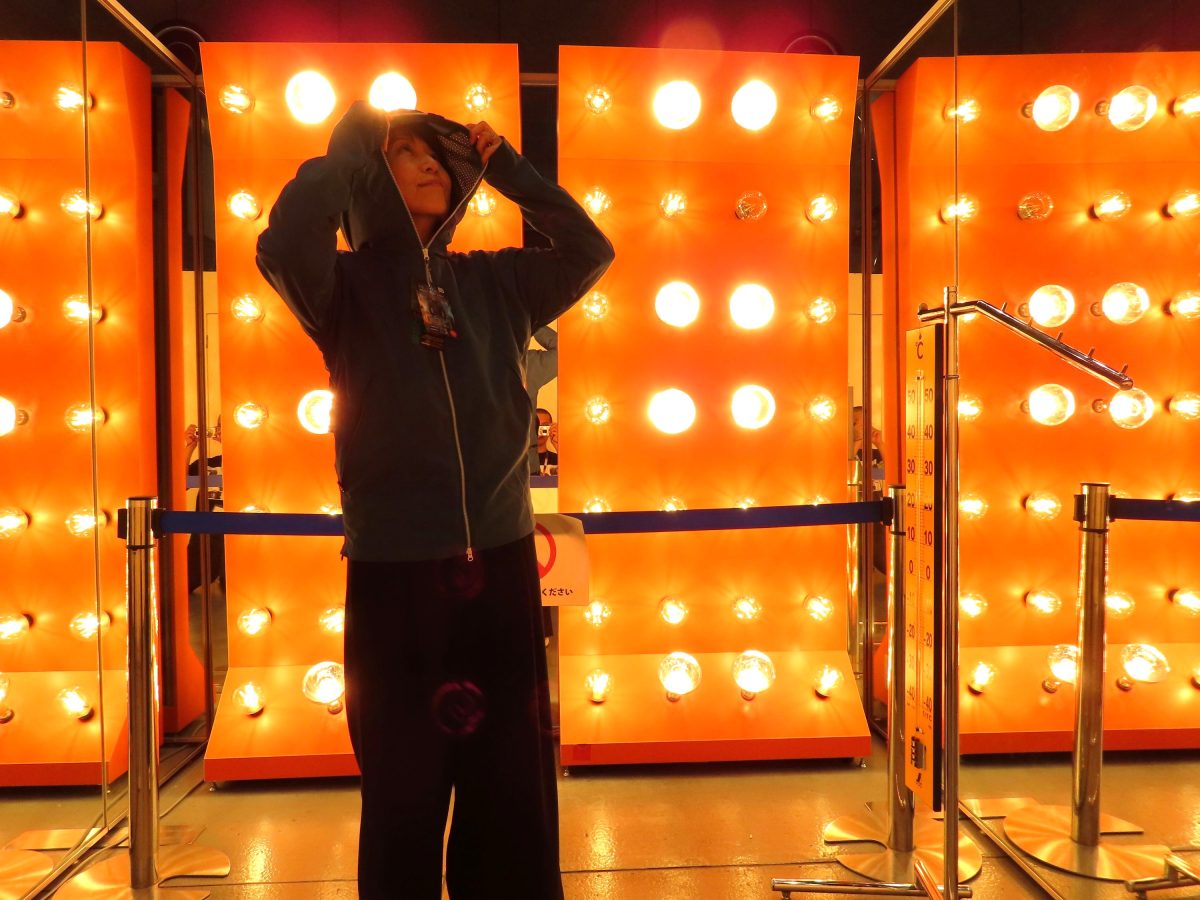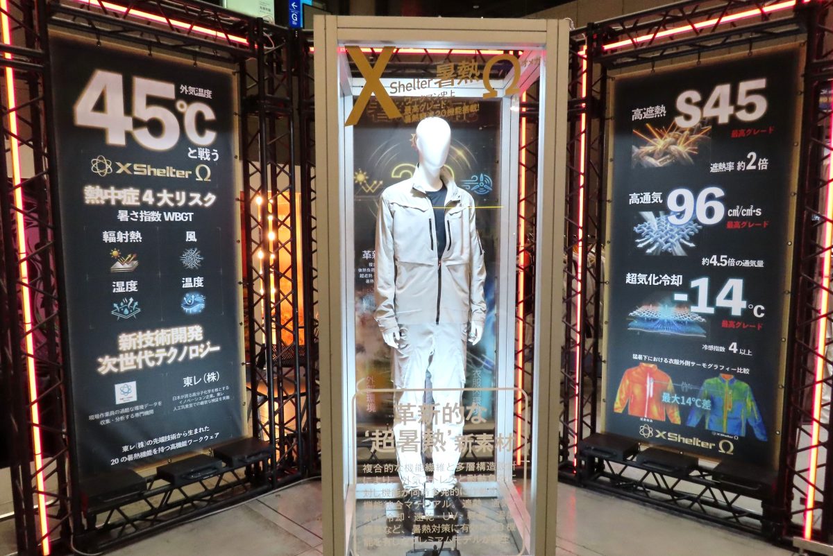 続いて、暑熱体験コーナーに。こちらは、新素材を採用した「XShelter暑熱Ω」を着用して、体験しました。気温45度の環境設定の部屋は焼けるような暑さでしたが、着用部分は、それほど暑さを感じませんでした。サーモグラフィの画像では確認しにくかったのですが、ジャケットから出ている頭部分は、かなり暑かったため、体はしっかり「XShelter暑熱Ω」でガードされていたことがわかりました。