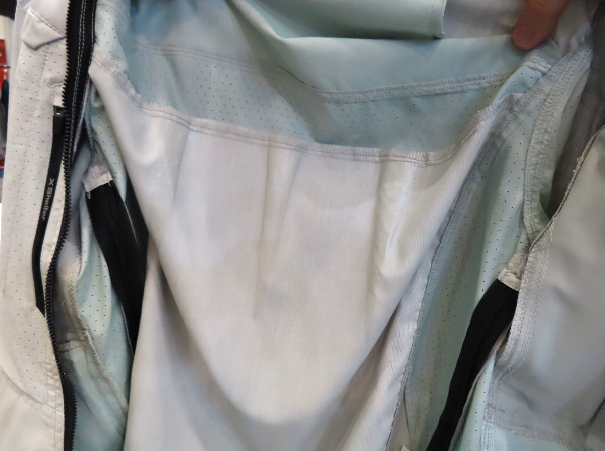 三角形の部分が浮き上がってきて、ジャケットの背中部分に凹凸ができます。これにより、体とウエアの間に空間ができ、風も通ります。気化冷却や透湿度、輻射熱など、最高グレードに加えて、一見わからない部分へのこだわりが詰まっていました。