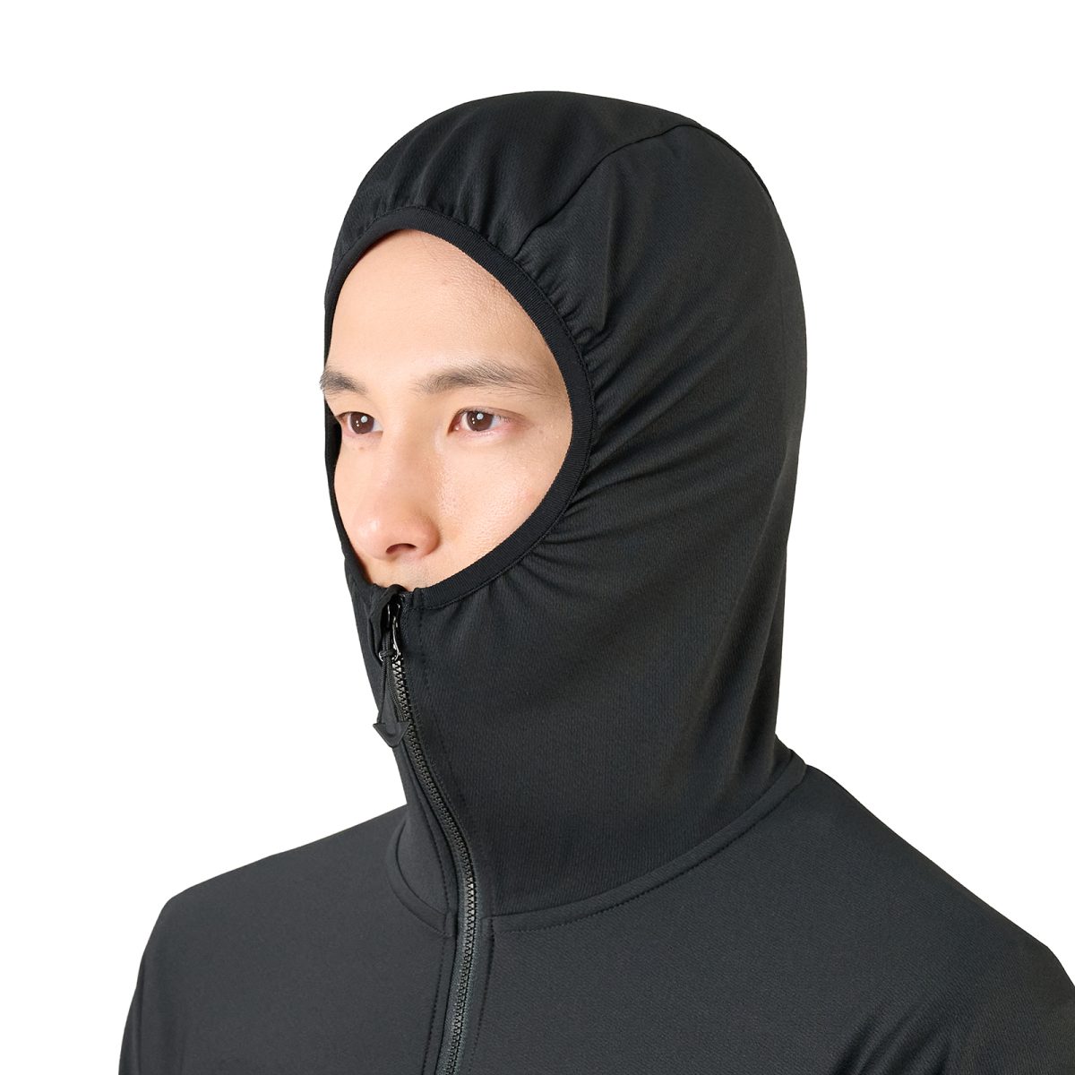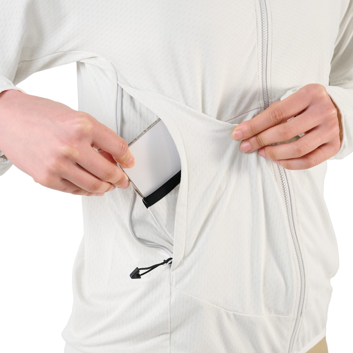 SOLAMENT により、UPF50+を達成しているフーディ。通気性に優れたメッシュ構造により、汗を素早く吸水・速乾させて肌面をドライにキープする。ストレッチ性に優れた動きやすく柔らかな着心地が特徴で、袖口は手の甲までしっかりガードするサムホール付き。