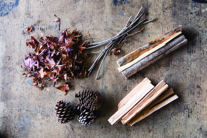 次にその着火! 焚き火の最大の難関です。薪は200℃以上で可燃ガスを発生します。その環境をスムーズに作り出すためには、大・中・小の薪を準備しておくことが大切です。まずは着火剤となるマツボックリや落ち葉を置いたら、小枝をのせ、さらに細く割った薪を上にのせます。炎が安定したら大きめの薪を少しずつ追加していきます。着火後はあまり薪をいじらず、炎が出ない時は、ファイヤーブラスター(火吹き棒)やふいごなどで空気を送ると、着火がスムーズです。