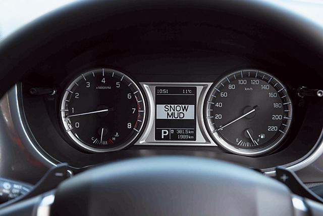 「走行モードの選択は、手元のスイッチを軽いタッチで動かすだけ。メーターのディスプレイに走行モードが表示されるので、操作のたびに視線を移動させる必要もない。4WDの経験が豊富なスズキならではの、ドライバーに優しい設計です」