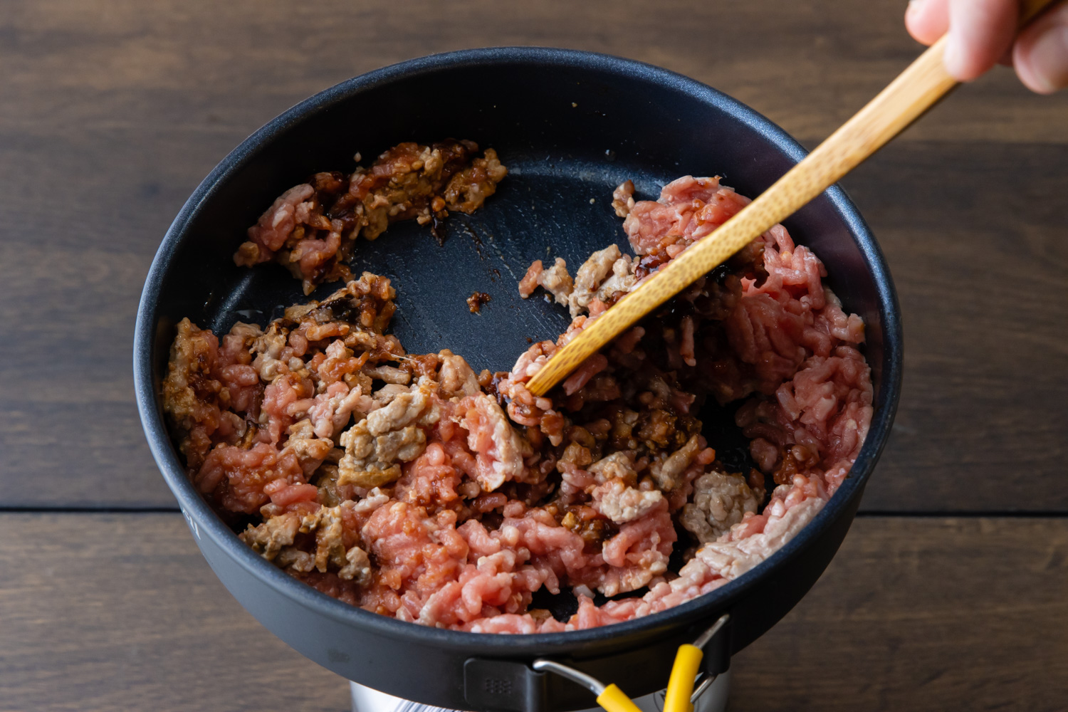 水分がとんできて、全体がまとまってきたら肉味噌の完成です。別鍋で麺をゆでながら、スープの準備をしていきましょう。