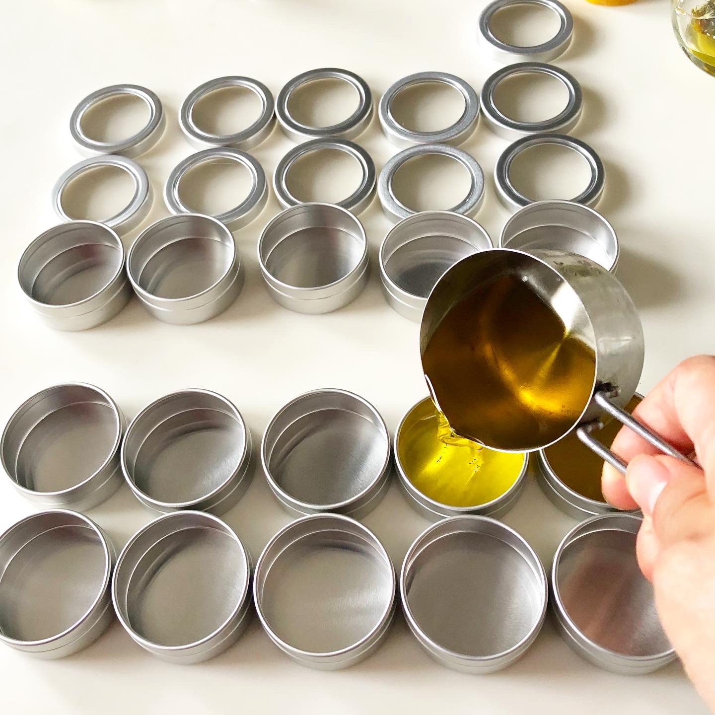 7. 完全にミツロウが溶けたら、精油を入れて混ぜ、すぐにバーム容器へ注ぎます。