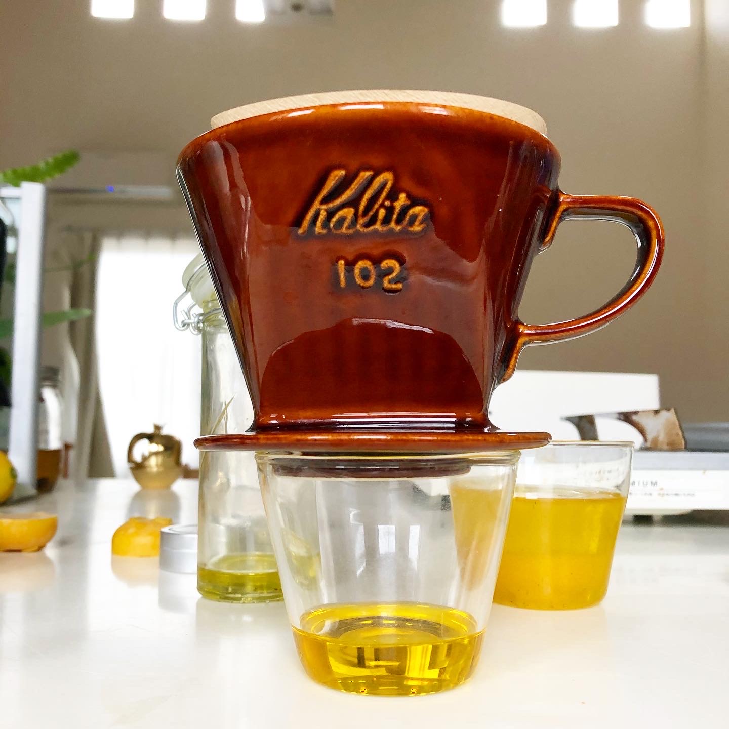 4. こし器で漉します。(フィルターを入れて「ゆっくり」待ちます)最後はタンポポを搾れば、「タンポポオイル」のできあがりです。