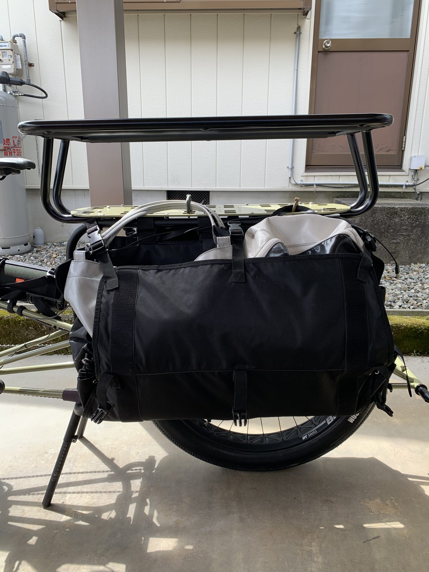 荷物を覆うカバーを内側へと収納し、外側のカバーを2つ折りにしたコンパクトスタイル。物が取り出しやすく、大きな荷物をあまり載せずにカッコよく走る時のモードだ。ちなみに右側のバッグは工具が入っている。