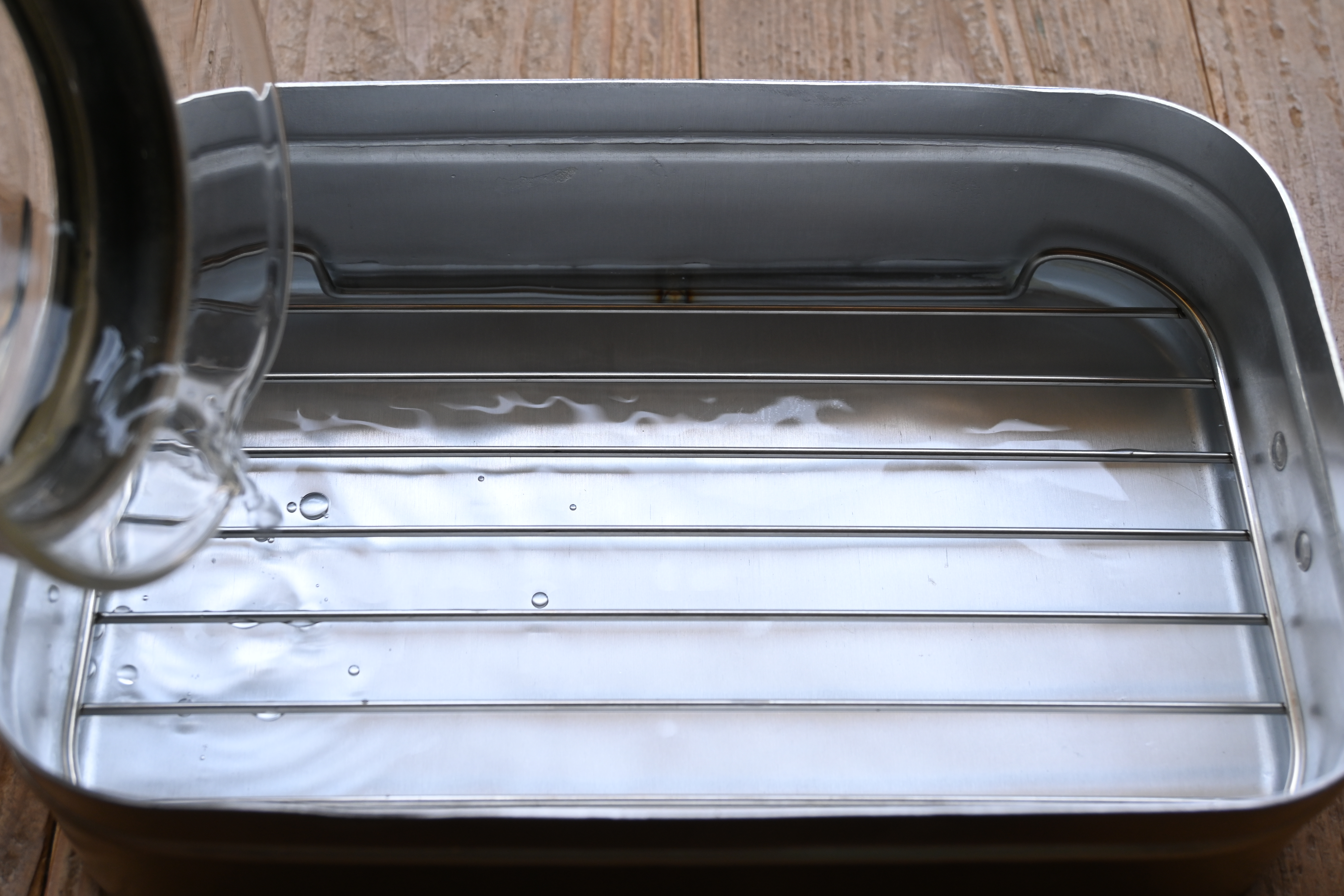クッカーに蒸し網を置き、蒸し網よりも低い位置まで水を入れる。蒸し網と同じ高さ以上に水が入ってしまうと、食材と水があたっているところはただの茹で料理になってしまうので気をつけよう。