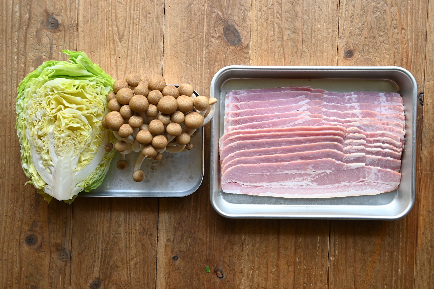 「キャベキ蒸し」の材料は、名前の文字をひろってそのまま「キャベツ」「ベーコン」「キノコ」だけ。この3つをそろえよう。今回はキノコにシメジを選びましたが、基本的にはなんでも大丈夫です。あとは塩とコショウ。そして食べる時にかける”タレ”があればOK。個人的にはポン酢系がオススメだけど、醤油でも、ごまだれでも、めんつゆでも、シーザーサラダドレッシングでも、そのままでも美味しい。