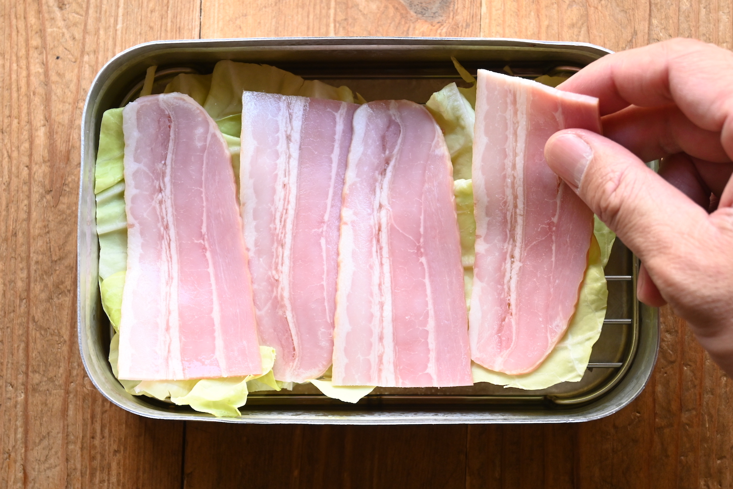 キャベツを並べた上にベーコンを並べていく。ベーコンのサイズが大きかった場合は折り曲げて並べていく。重なる部分をなるべく少なくすると、仕上がりが綺麗でかつ食べやすくなる。