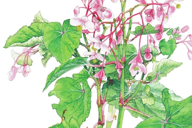 ベゴニアの仲間「シュウカイドウ」は紅色の花が下垂して咲く