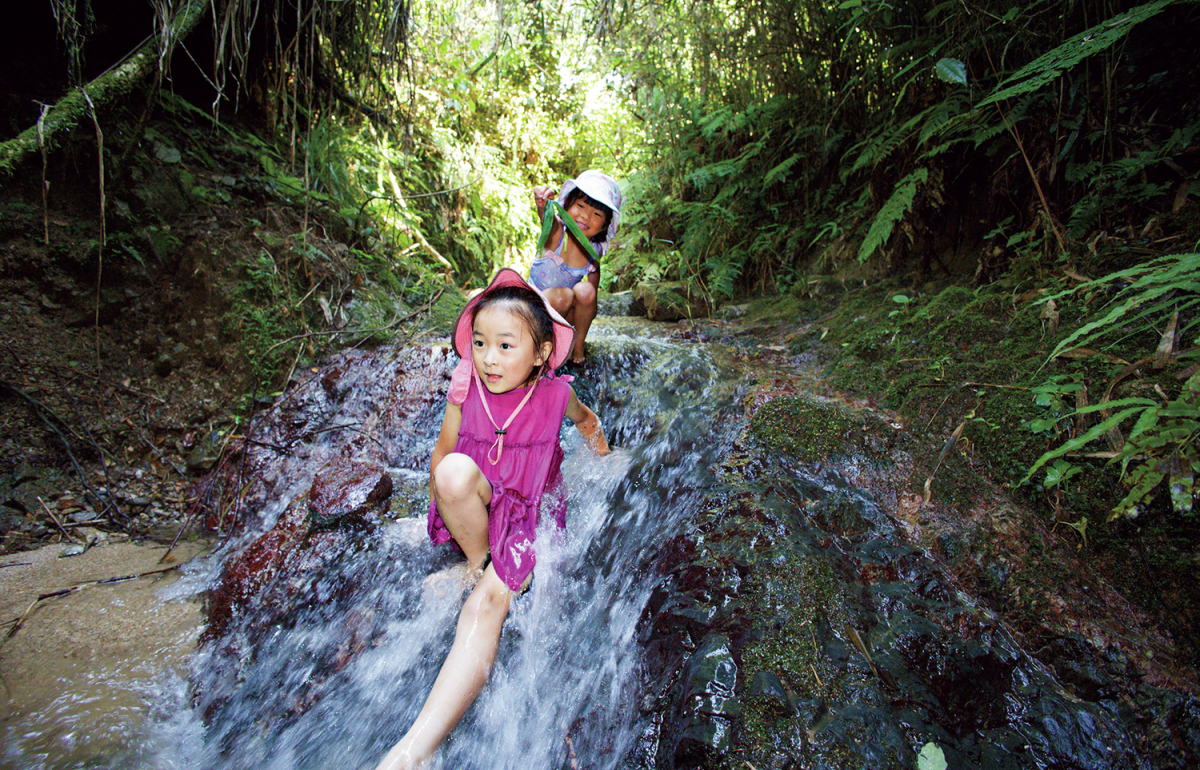 敷地内を清流が流れている。浅瀬なので小さい子も安心。短いながら滝滑りも楽しめる。