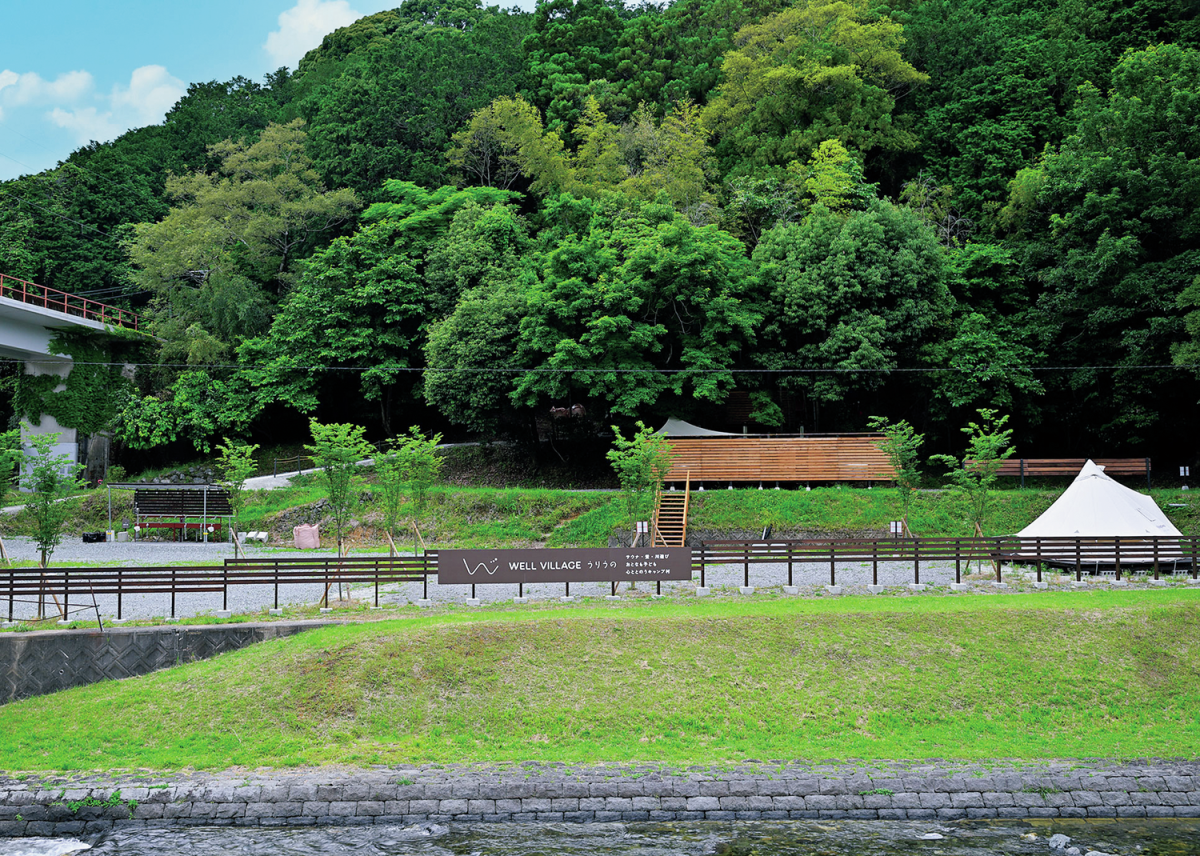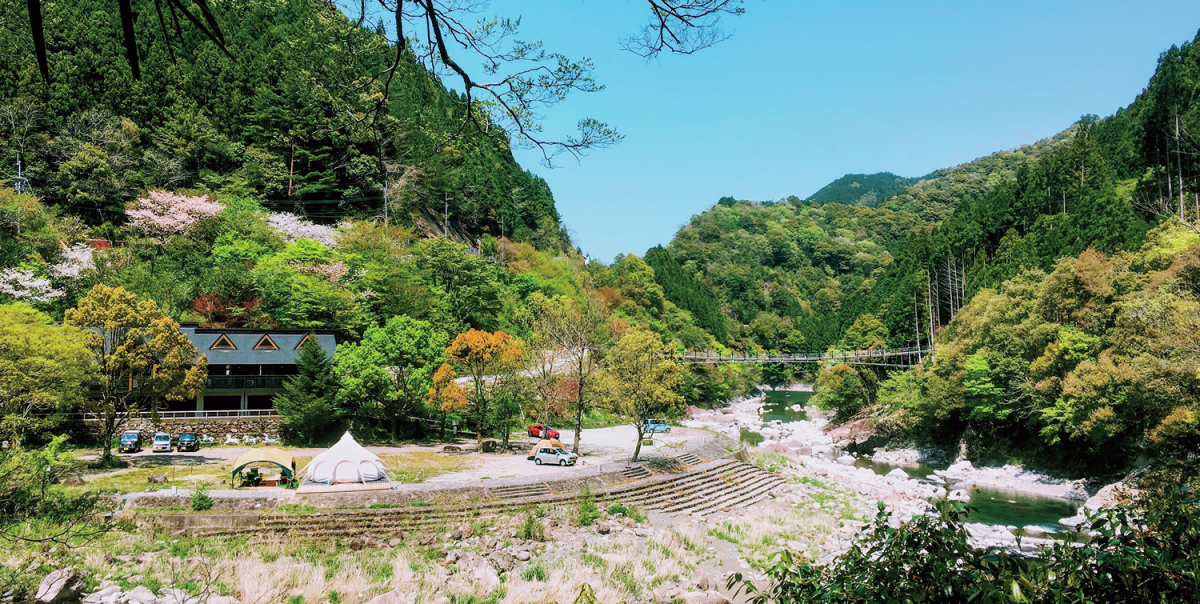 ハイキングの人気スポット、曽爾高原にほど近い景勝地、奥香落渓の小太郎岩の麓に2021年7月に誕生。約3,000坪の広い敷地は清流・青蓮寺川沿いに位置していて、秋は紅葉、冬は雪景色と、四季折々の自然が楽しめる。