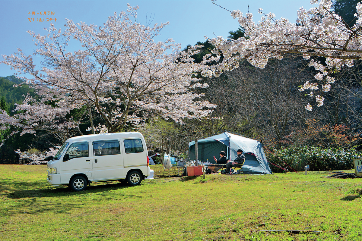 テントサイトは手前サイト(旧区画サイト)と奥サイト(旧フリーサイト)の2種類で、いずれもフリーサイトで、車の乗り入れが可能。気田川に沿うようにソメイヨシノの並木が続いていて、どちらのサイトからもサクラを眺めることができる。気田川の景色とサクラを楽しみたければ、キャンプ場入り口の高台に位置するスーパーコアサイトもオススメだ。