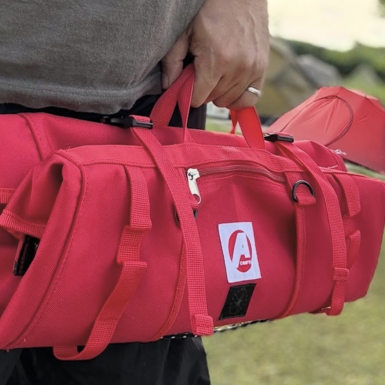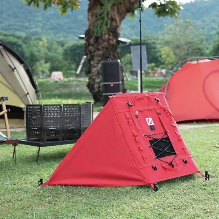 こちらは“アシモレッド”カラーの生地で作られた焚き火用風防。韓国のブランド「brennholz」に別注したアイテムで、付属の分割式ポール2本付きでペグ4本で設営が可能となっている。設営状態でも折りたたみ状態でも収納力もあり、焚き火ツールなどをしまっておけるのも魅力だ。