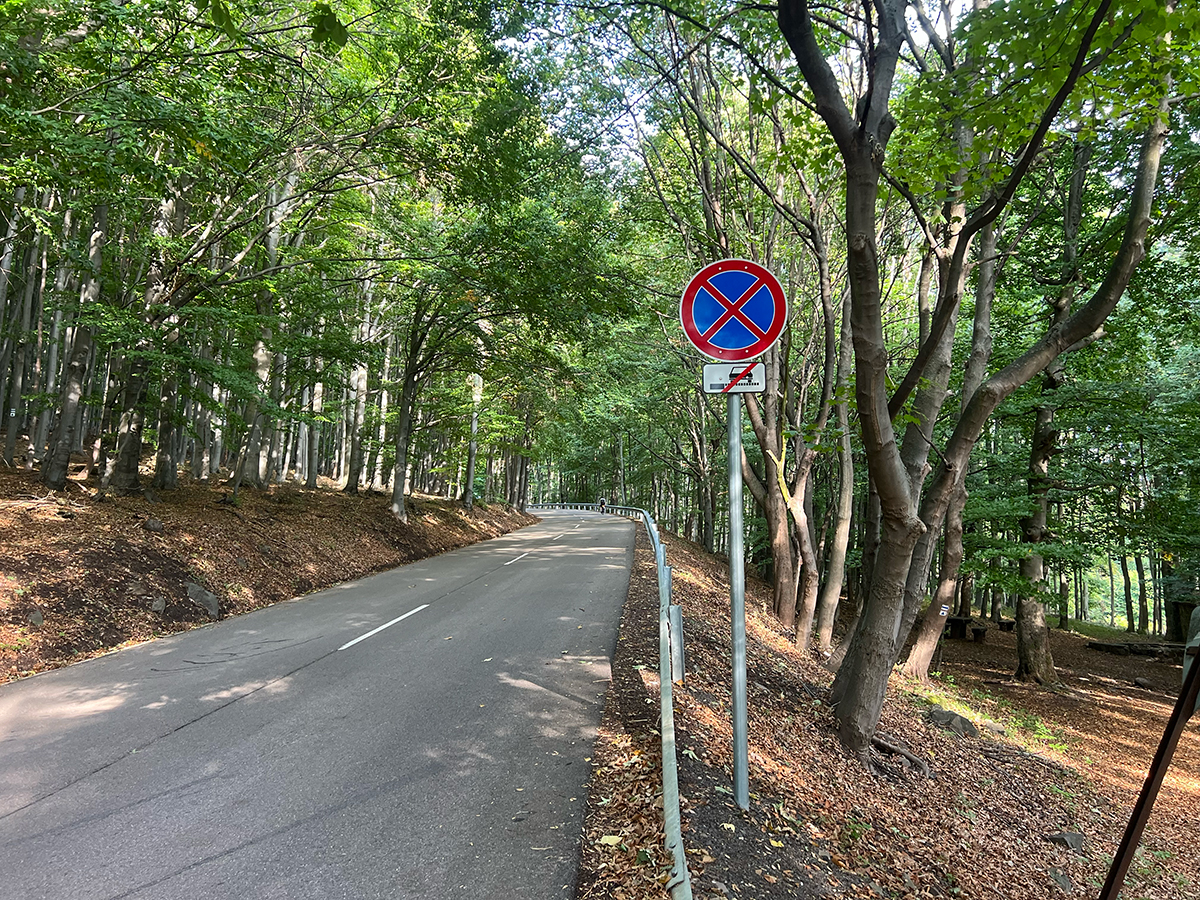 他に登っている人の姿もほとんどなく、静寂の中でゆったりと歩ける贅沢な時間を楽しめます。頂上近くになると、車が通る道路に出てきます。ここまで来れば、あとは標識に沿って少し登るだけで、頂上はすぐそこです。