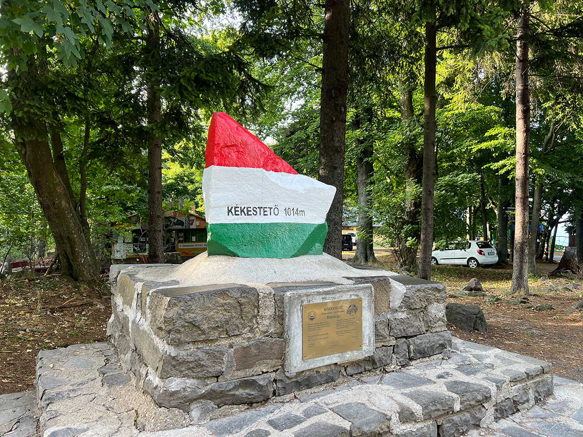 標高1,014m、ハンガリー最高峰・ケーケシュ山の山頂標識。国旗カラーに塗られたデザインが印象的です。