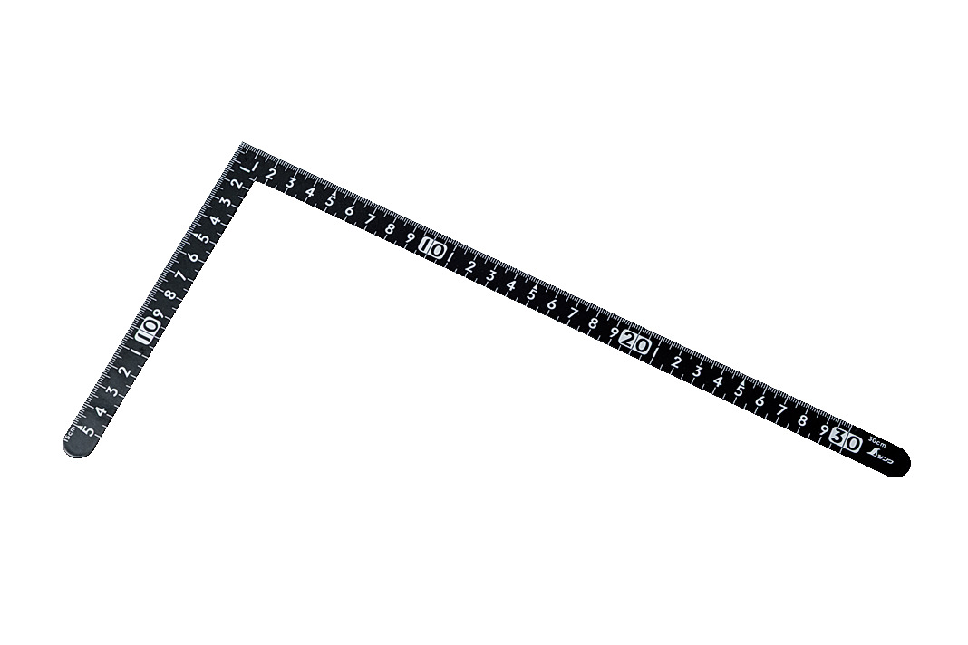 直角部分を使って真線を引いたり、一定の角度の線を入れたり。両面に目盛りがあり反対向きにも使える。