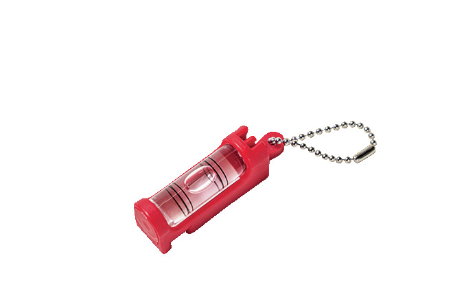 気泡の位置で水平を測る。気泡が中央にあれば水平。{53367}写真の製品は垂直方向も測れる。キーホルダータイプも。