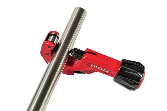 スチール、真鍮、アルミ、塩ビなどに。工具をパイプの太さに合わせ回転。徐々に切り込みが入るしくみ。