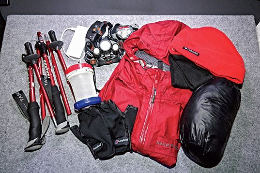 ナイトハイクの必需品。トレッキングポール、モバイルバッテリー、折りたたみ式ランタン、ヘッドランプ2灯、グローブ、レインウェア、防寒着。