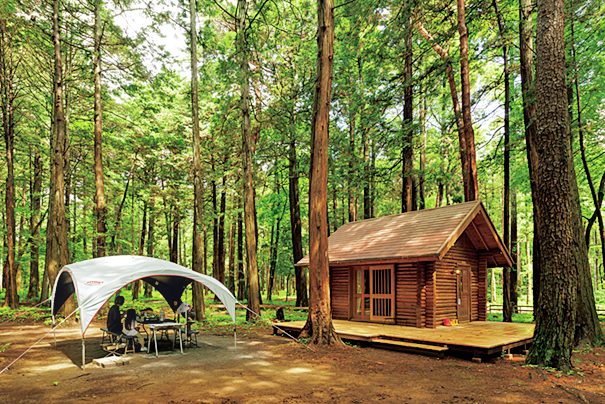 ログキャビンには野外ダイニングが付属。室内は冷暖房完備、冷蔵庫、マット、寝袋などが備わっている。15,000円~。