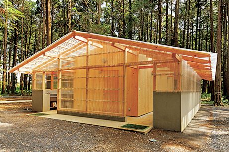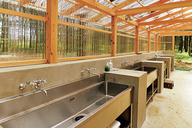 炊事場とトイレのあるサニタリー棟はフリーサイトと区画サイトの両方にある。