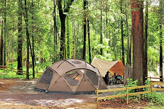 山の斜面を切り拓いて誕生した自然豊かなキャンプ場。テントサイトはバリエーション豊富で、管理棟上方にある上段オートサイト、山の中のペットサイト、下方の下段オートサイト、ペットサイト、渓流サイトなど。渓流サイト以外は車の乗り入れ可能だ。