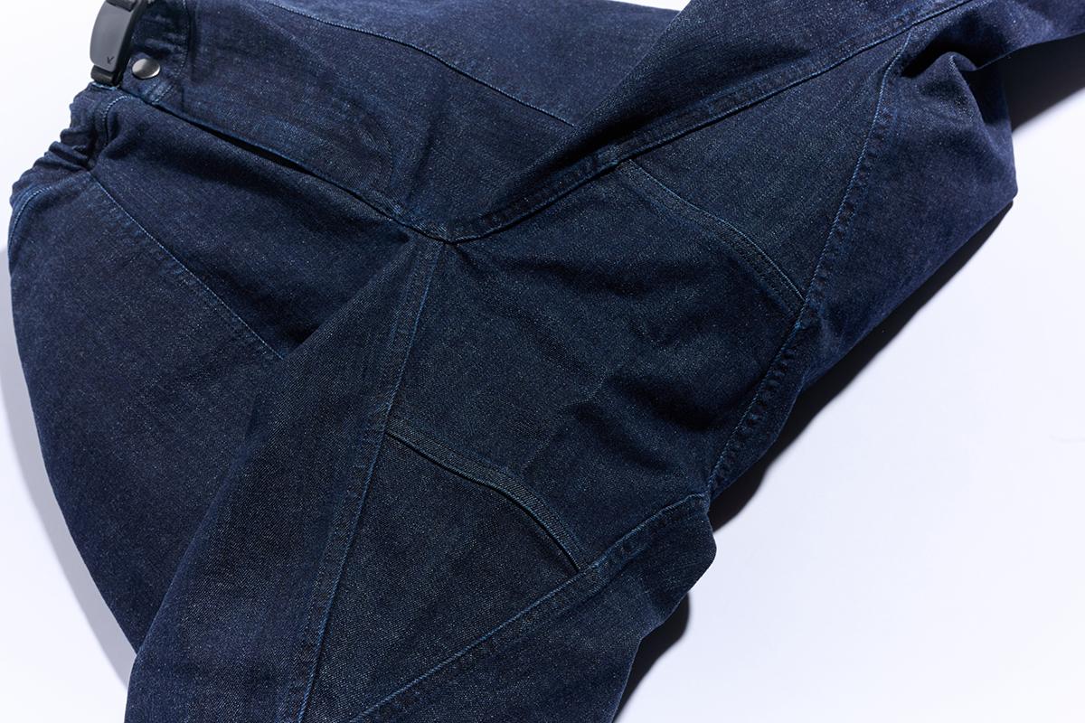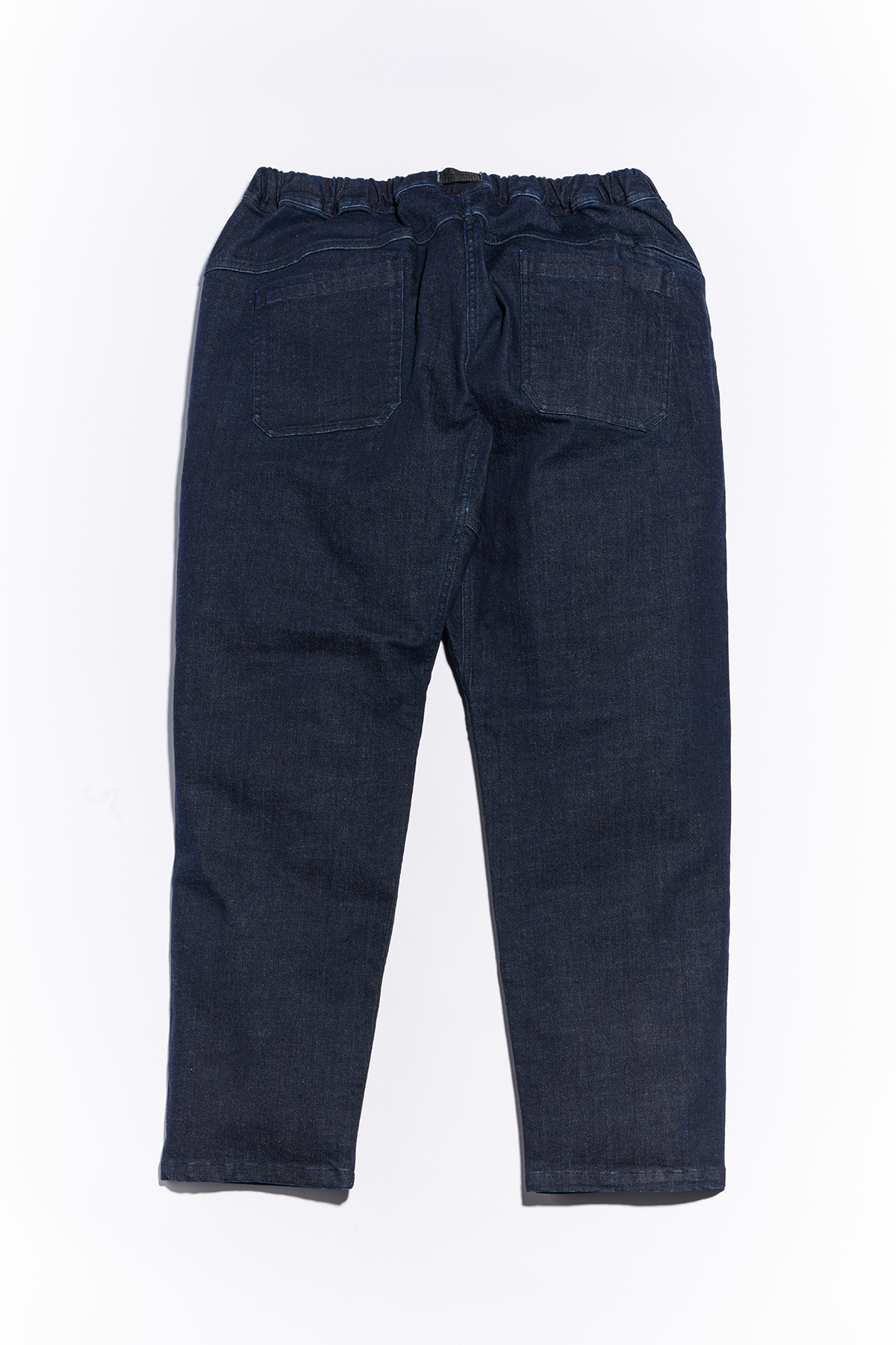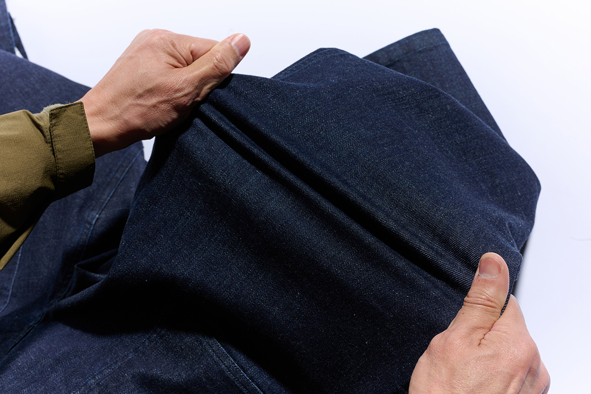 ユーズド加工をしていない清潔感のあるインディゴブルーだから、街でおしゃれウェアとして着ていただいてよいのだが、せっかくクライミングをルーツとするROKXと作ったのだから、ぜひキャンプやピクニックではいてほしい。まず素材を見ていこう。コットン主体だが、ポリウレタンを2%配合し、ストレッチ生地となっている。