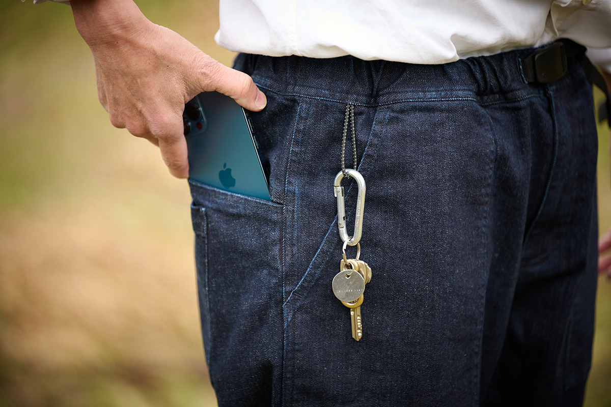 ポケットもよく練られている。フロントポケットもヒップポケットもマチなしだからシルエットを崩さない。フロントは縦長にして容量を増やしている。また、右側面には隠しポケット的にスマホポケットが付いている。この位置がなかなか秀逸で、やや後ろめに付いているので、脚の運びをさまたげない。座ったときも邪魔にならないから落としにくい。同じく右側面にはキーリングが付いていてカギやチェーン付きウォレットなどを装着可。アウトドアではポケットの中身を出し入れすることが多く、いつのまにか落としがち。小さなことだが、このキーリングは役に立つはずだ。