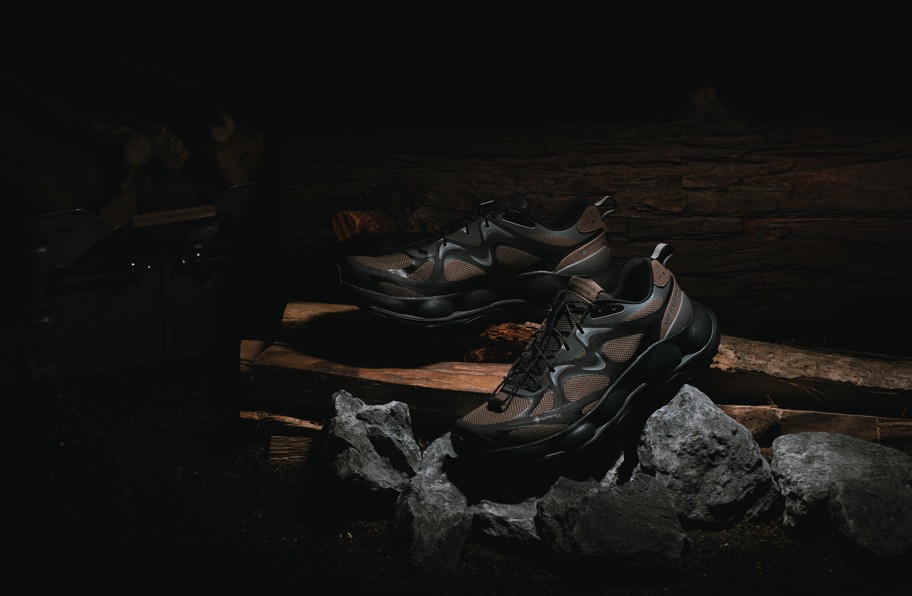 カラーリングはフィールドに存在する樹皮や土、石といった自然の有機物・無機物から着想を得て構成。インソールには森の深緑や黄昏時の夕陽をイメージした左右非対称の配色を採用している。