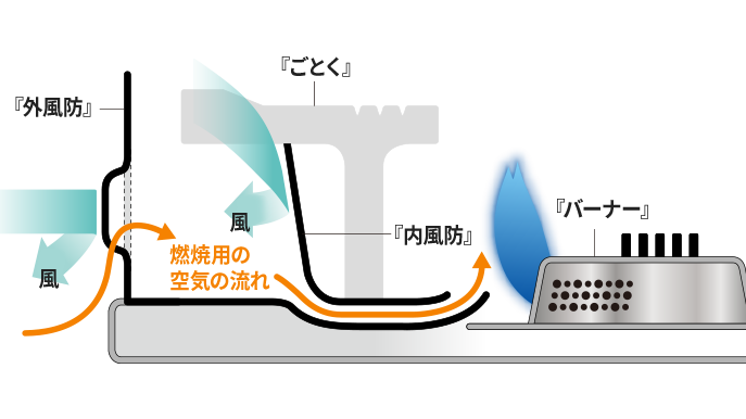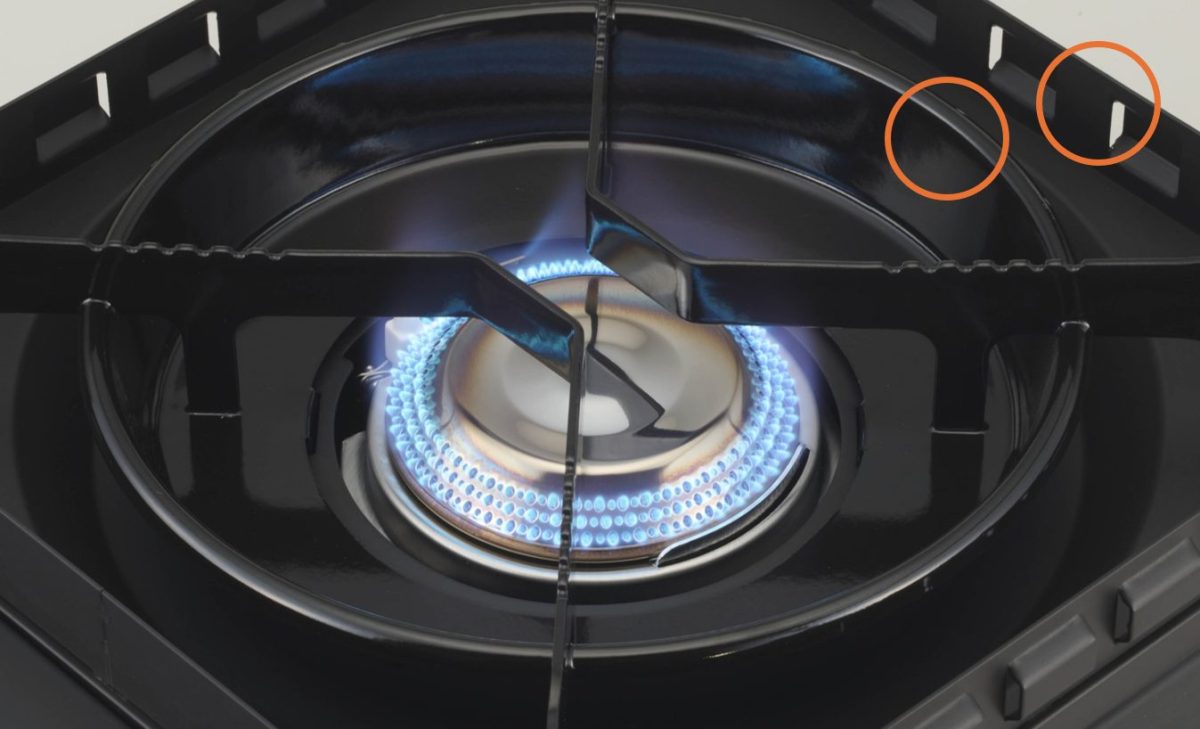 ふたつのバーナーは最大3500kcal/hの出力。様々なサイズのクッカー、フライパンを使用できるため便利。