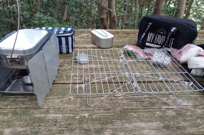 針金と水切ネットによる折り畳みソロテーブル[読者投稿記事]