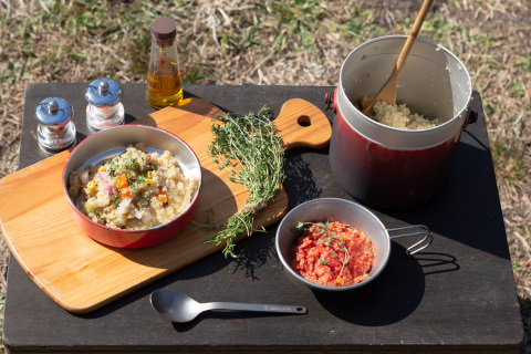 焚き火×飯盒で作る『キヌアのピラフ』。さらに「トマト雑炊」などアレンジ自在!