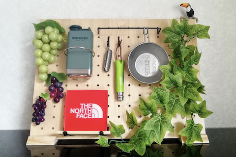 ダイソーのデザインボードを8種のアレンジパーツでカスタマイズ!キャンプ用品ディスプレイをDIYしよう