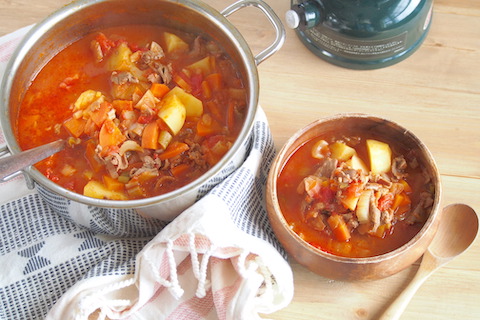 冬キャンプで身体を芯から温めてくれる料理「ラム肉のトマト煮込み」レシピ