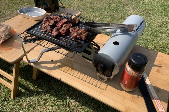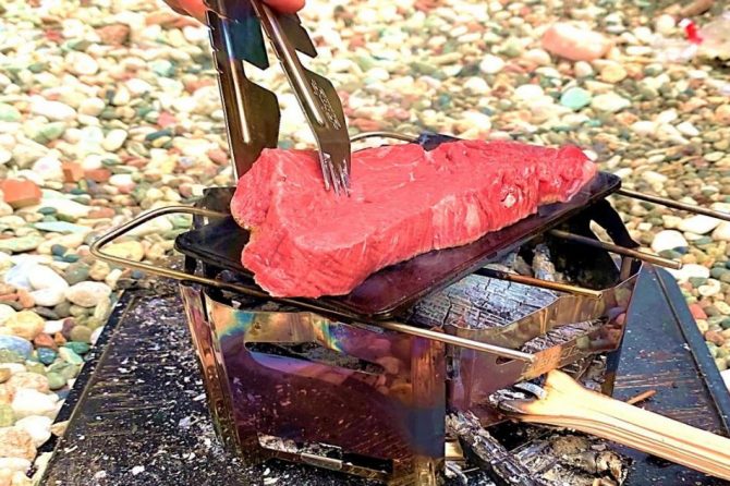 BE-PAL×笑’sのMINI焚き火台と、ダイソー品がコラボした六角形のMYオリジナル焚き火台で肉を焼き、ソロ・トングで調理してみた![読者投稿記事]