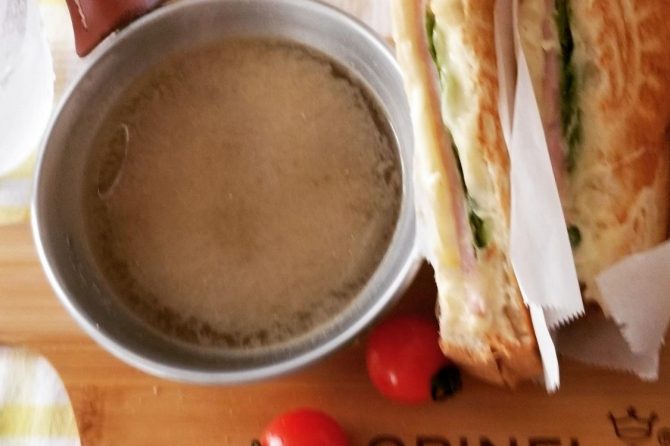 チーズたっぷりハムホットサンドとあご柚子スープ[読者投稿記事]