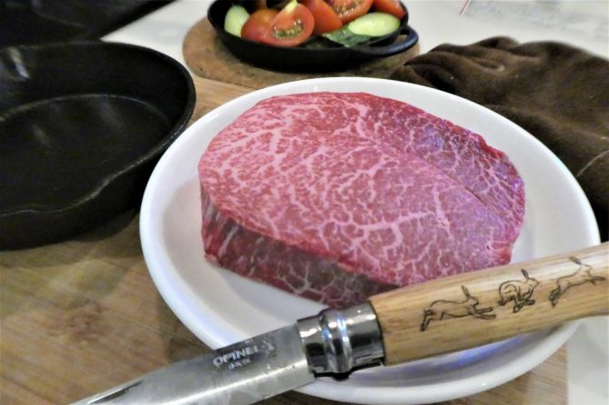 厚い肉を焼いてオピネルでカットする[読者投稿記事]