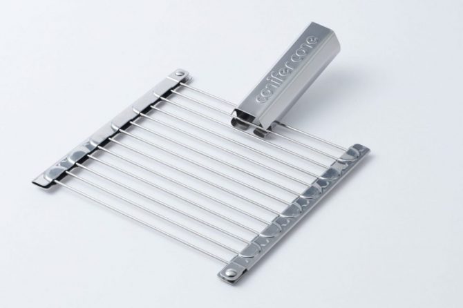 コニファーコーンは焼き網も折りたたみ式にしちゃった! ハンドル付きだから薪や炭もくべやすいのだ