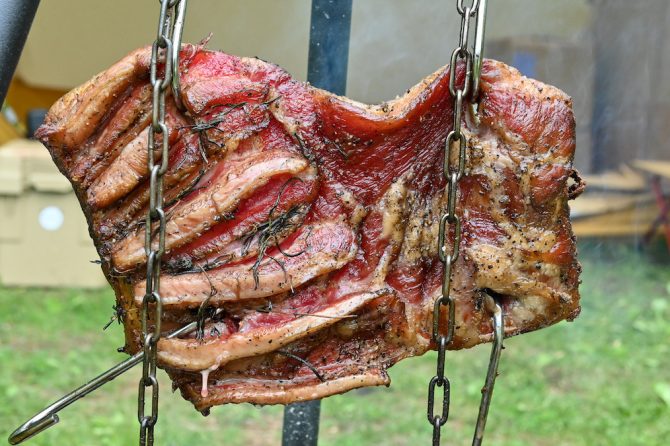 焚き火のついでに、極上の炙りベーコンを作ってみては?