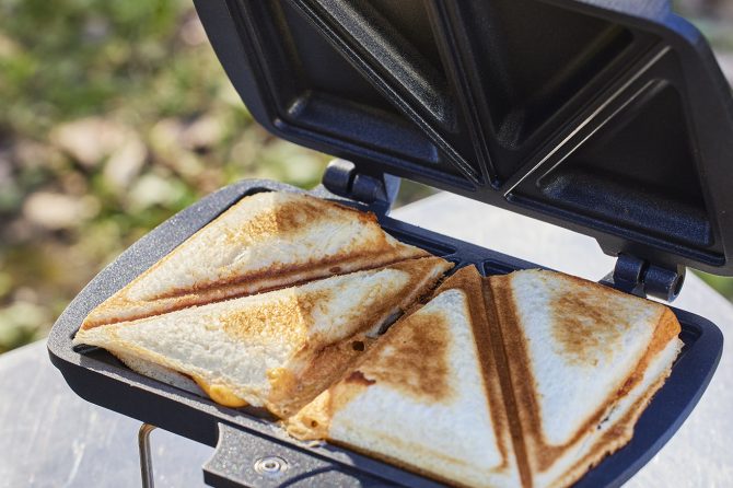 一度に4つが焼けるホットサンド器。ハンドルもたためる!