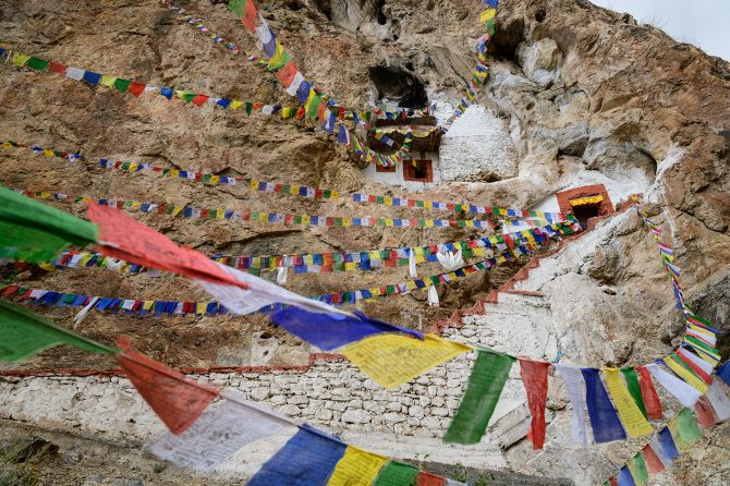 村の背後の岩山には、チベット仏教ゲルク派に属する大僧院、カルシャ・ゴンパがあります。まるで要塞のような勇壮な佇まいのこの僧院には、約100名の僧侶たちが在籍していて、日々の修行に励んでいます。